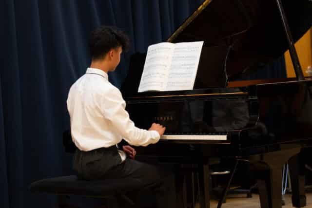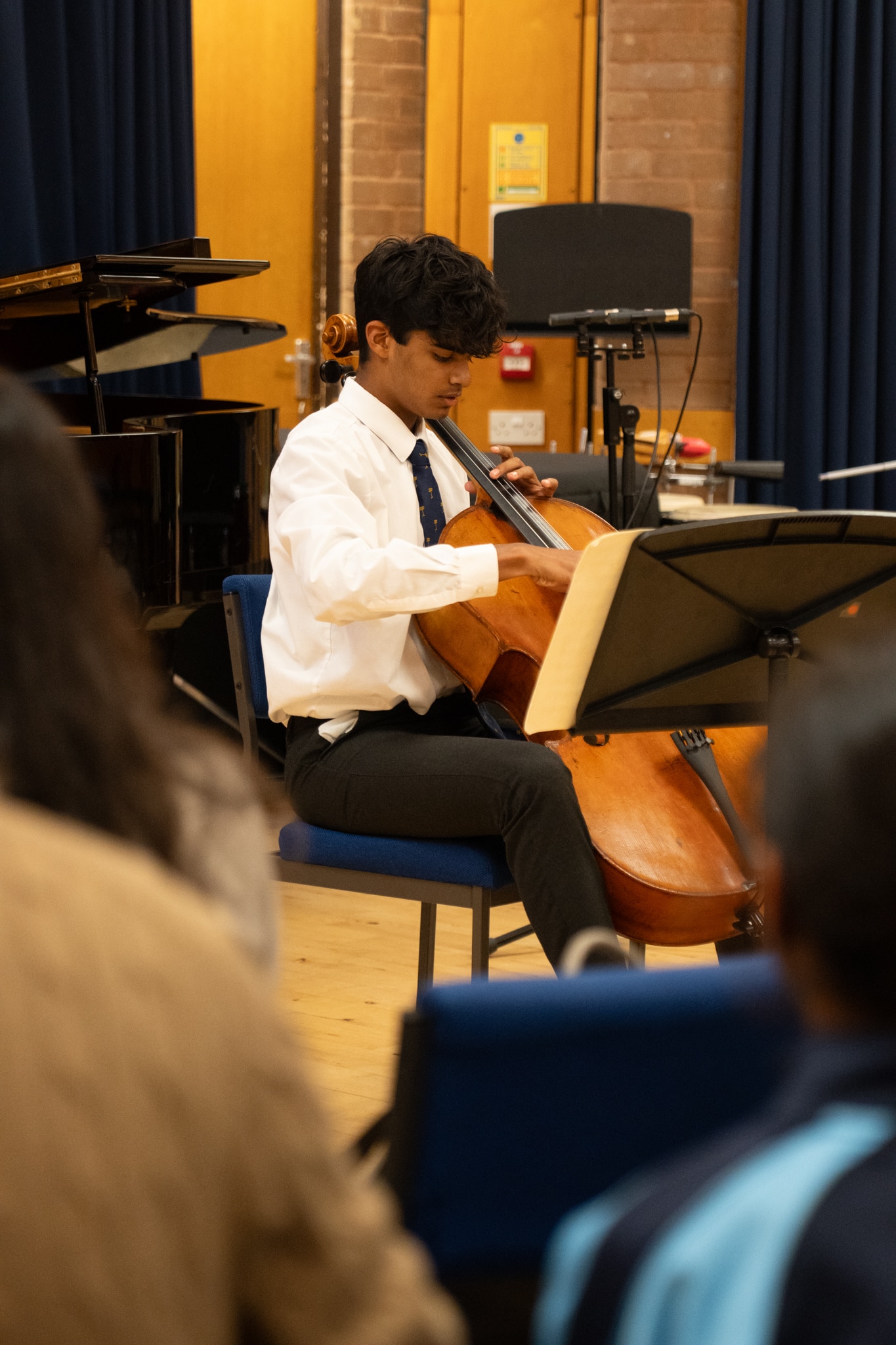The concert opened with Aiden de A. (Divs) playing the first movement from Brahms’s cello sonata in E minor, which set a high mark for the standard of performance in the concert. This was followed by the suitably fluid rendition by Krish S. (5ths) of Mel Bonis’s Il pleut on the piano. New Music Exhibitioner Bertie M. (4ths) then took to the stage with the enchanting Rêverie by Glasunov. Another cellist, Thomas M. (Divs) played the lyrical Poème by Andrew Adorian. Another new Music Scholar, Shota A. (3rds) dazzled the audience with his suitably direct performance of Chopin’s so-called “Revolutionary” Prelude for piano, which contrasted with the relative calm of Elliot M.’s (4ths) choice of piece, Paganini’s Cantabile. The only woodwind player of the concert, Dhiren K. (L6ths) then gave a performance of the enduringly popular extract from Prokofiev’s Romeo and Juliet, namely The Montagues and Capulets. This was followed by another Rêverie, this one by Debussy, played sensitively on the piano by Milan A. (5ths). Mendelssohn’s Song without Words for cello was played next by new Music Exhibitioner Aary P. (4ths), which was followed by Josh S.’s (4ths) impressive rendition of Chopin’s Nocturne in B-flat minor. The penultimate performance of the evening was by Louis F. (3rds) on the cello, whose mature interpretation of Fauré’s Élégie delighted the audience. The concert closed with The Acrobat, the light-hearted trombone solo by J. A. Greenwood, performed by Alexander B.-T. (4ths).