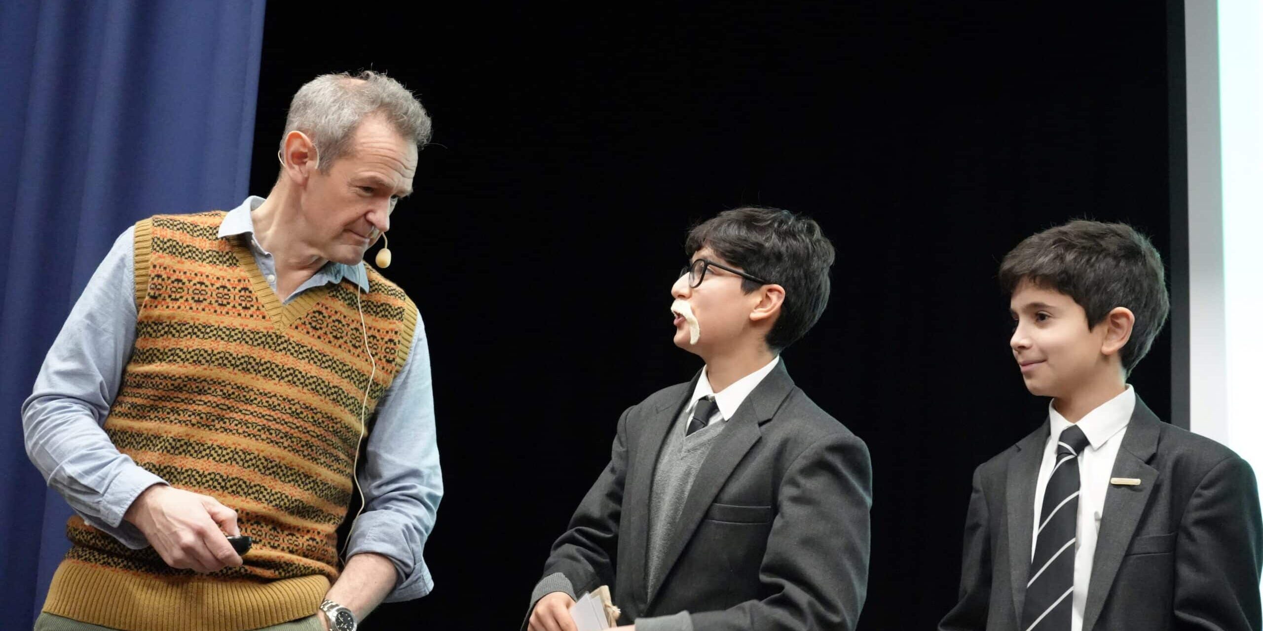 Last week the Upper Thirds were invited to Merchant Taylors’ Prep School for a special visit from actor, comedian and television presenter Alexander Armstrong, who came to share his debut fantasy adventure Evenfall: The Golden Linnet. The novel introduces thirteen year old Sam, who believes he is an ordinary boy until he uncovers his family’s ties to a long hidden secret society. This ancient order once safeguarded humanity, but now dark forces are rising again and Sam is drawn into a world of magic and danger where the choices he makes could determine the fate of everyone.
