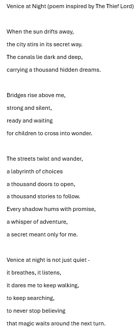 Venice at Night, an atmospheric poem by Hugo G. (3rd) based of Cornelia Funke’s book The Thief Lord took first prize for Creative Writing.
