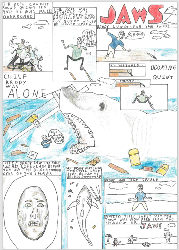 Leo M. (U3rd) won the artwork prize with an extract from Jaws by Peter Benchley presented as a hand drawn comic strip.