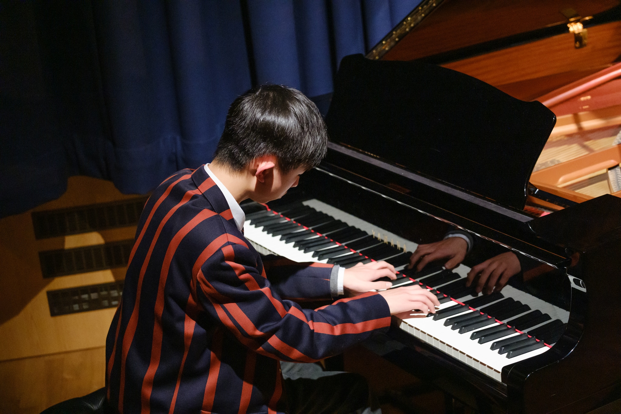 The final class, of pianists, opened with Yishen L. (3rds) playing one of Scarlatti’s finely-crafted sonatas. Xiling W. (MTP) then returned to the spotlight for his performance of Gliere’s deceptively titled Prelude in D-flat from 8 Pieces Faciles. Ronan K. (3rds) played next, giving an atmospheric performance of Bera-Tagrine’s Terminal 2. Jayde L. (MTP) made another appearance next, with his carefully-crafted performance of Debussy’s Dr Gradus ad Parnassum. The final performance of the evening was Lizst’s Liebestraum No. 3, played by by Shota A. (3rds).