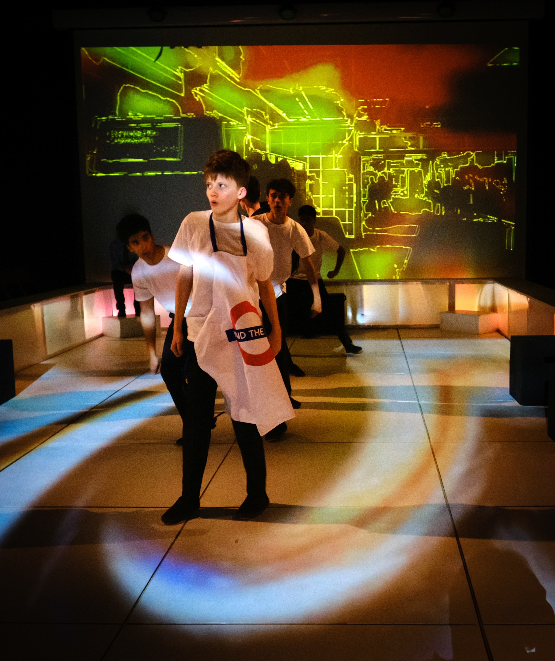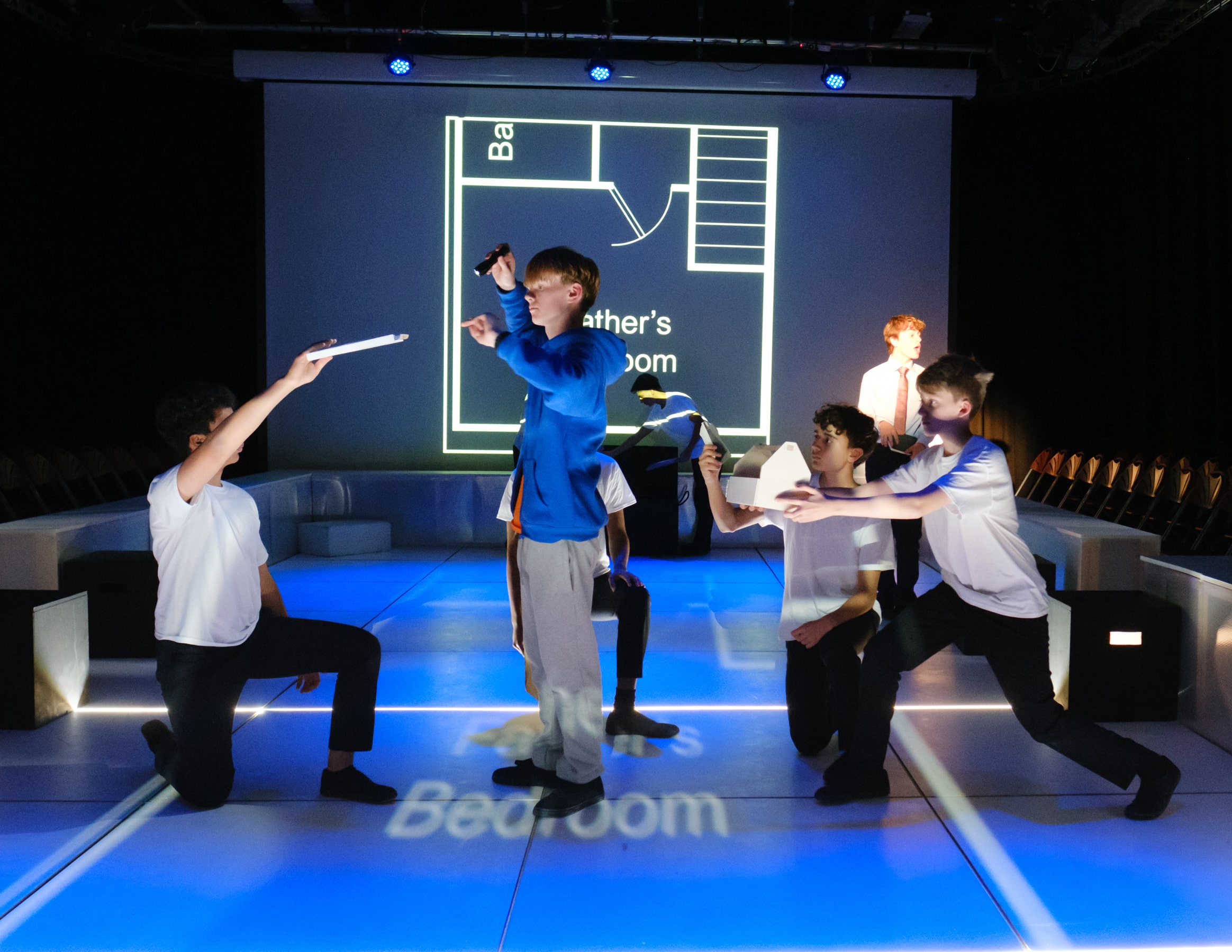 Elsewhere, there was plenty of comic relief provided by Chase (Mrs Alexander), Monty (Reverend Peters), and Emily as the repetitive Headmistress Mrs Gascoyne. Rien, Pranay, Charlie, and Prem were effective as a succession of down-to-earth policemen, each taking their opportunity sharply and quickly to define their character, while Harlene captured well the anger and frustration felt by a woman who loses first her husband and then her dog. Chaitya, Jai, Krish, Markus, Mahir, and Leo carried a series of smaller roles well but were at their very most effective when deploying physical movement to support the story, most powerfully of all when helping to portray the challenges of Christopher’s journey to London and his father’s attempts to stop him. Is there anything more welcome than a bit of Frantic Assembly in a play to add height and movement? It was sharply done and elegantly delivered.
