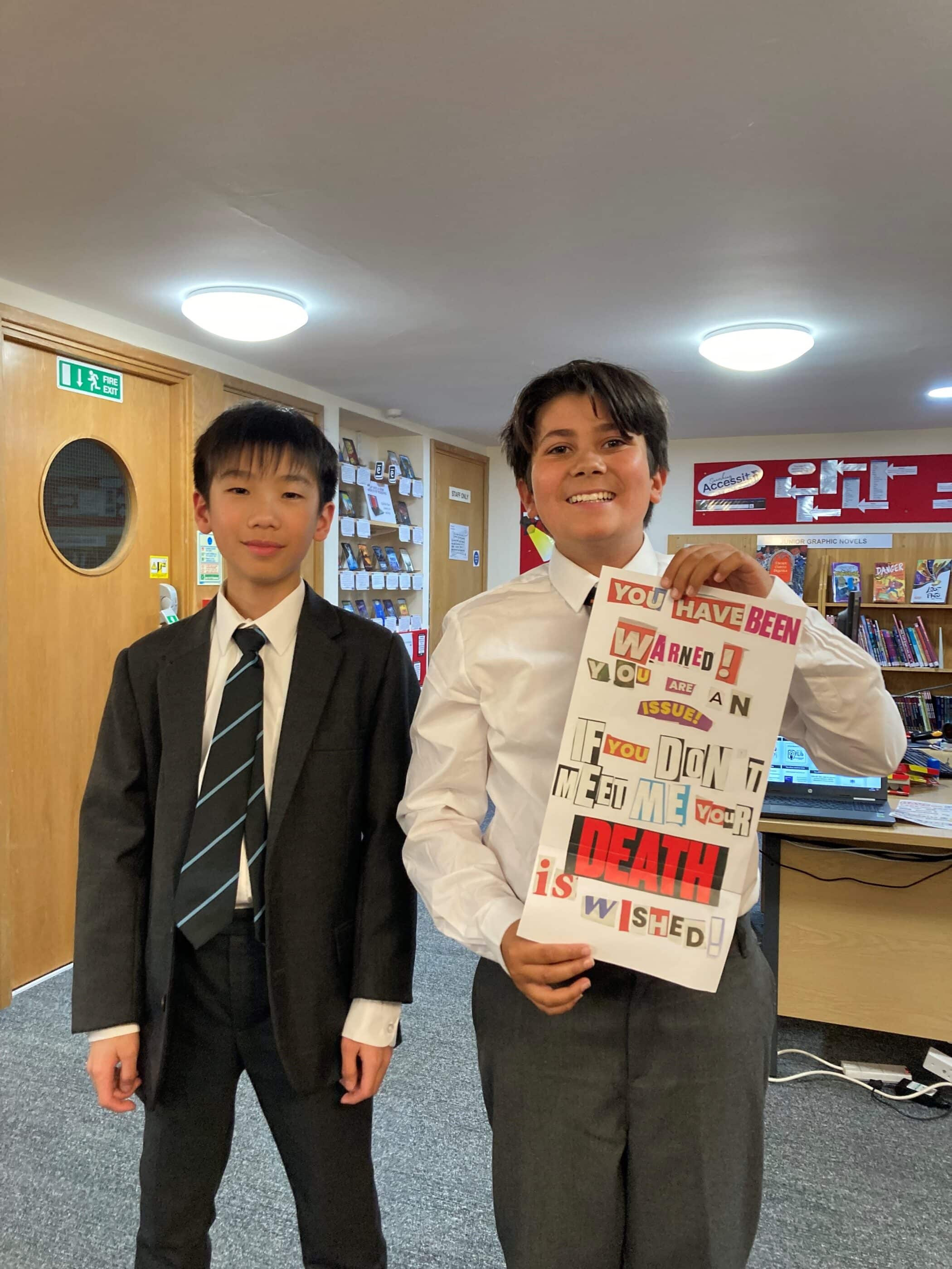 The Book Boffz soon found themselves surrounded by a sea of pages and colourful cuttings as they carefully pieced together their creations. What at first seemed like a light-hearted activity quickly proved to be a bit more demanding than expected, requiring patience, imagination, and much swapping and trading of cuttings. Lucas G. (3rds) and Louis Q. (3rds) and Joshua A. (U3rds) embraced the traditional idea of a ransom note – full of dramatic demands and mystery- while others leaned towards something more poetic in tone.