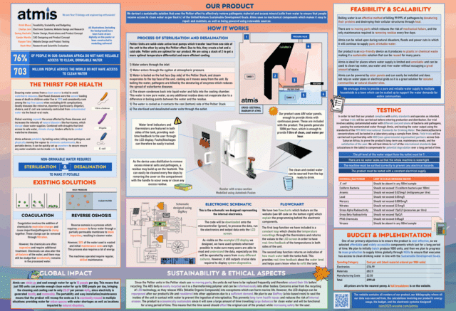 Together, we devised and designed Atmis – a water purifier based on the thermoelectric Peltier Effect to evaporate and condense pure water, designed for drought-stricken countries with shortages of clean water and climate-change-intensified natural disasters. By using this effect, we were able to keep water at one temperature of just 2 degrees Celsius once cooled. We worked together to create our initial poster, creating CAD diagrams (including the internal electronics), tested our procedures, and created a budget.