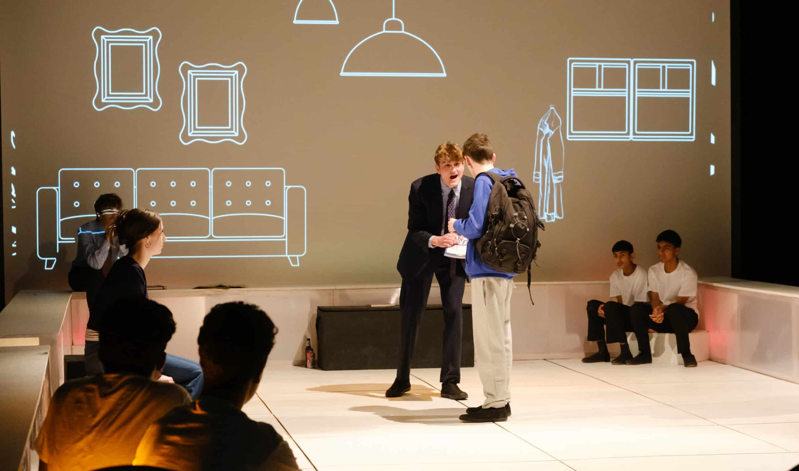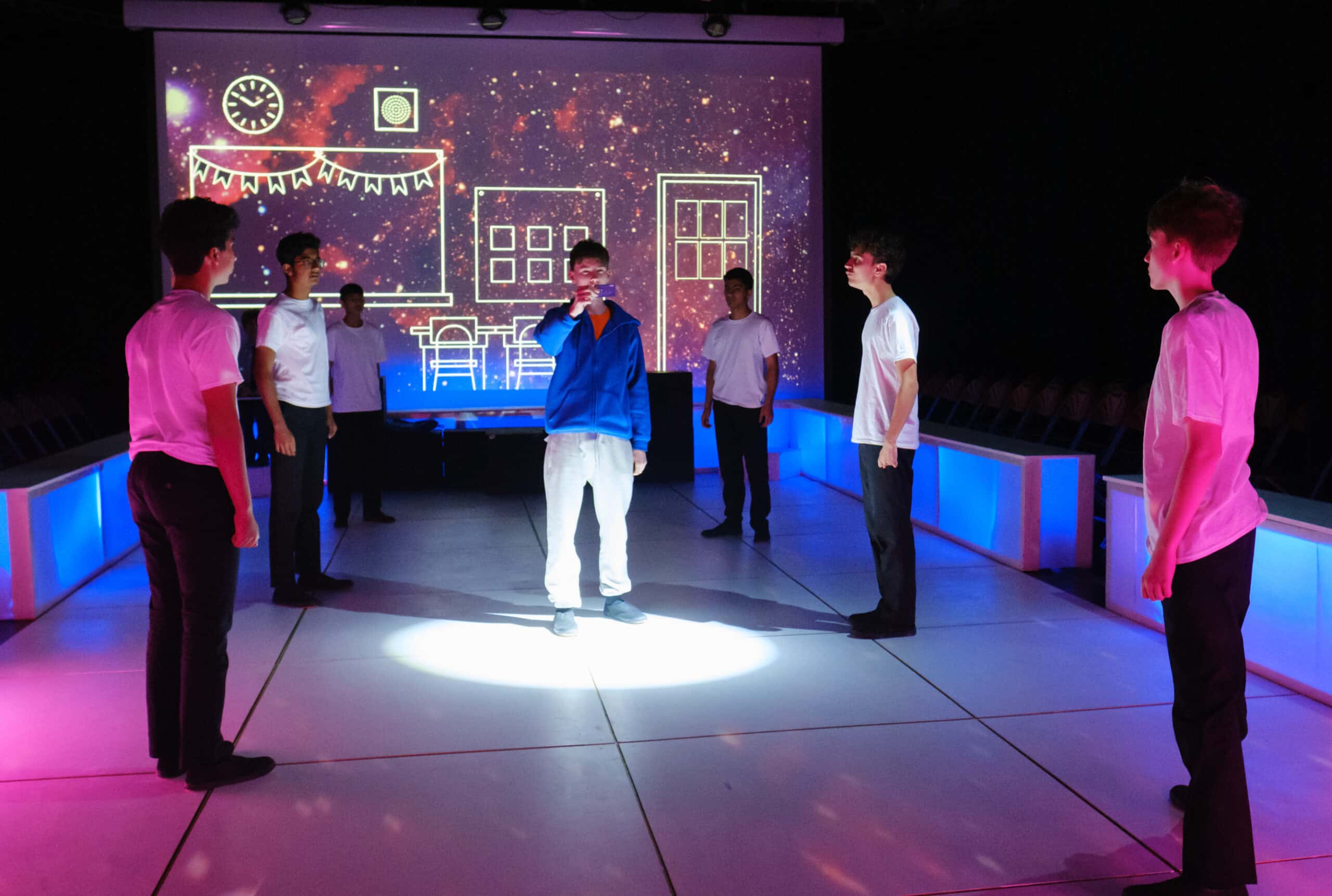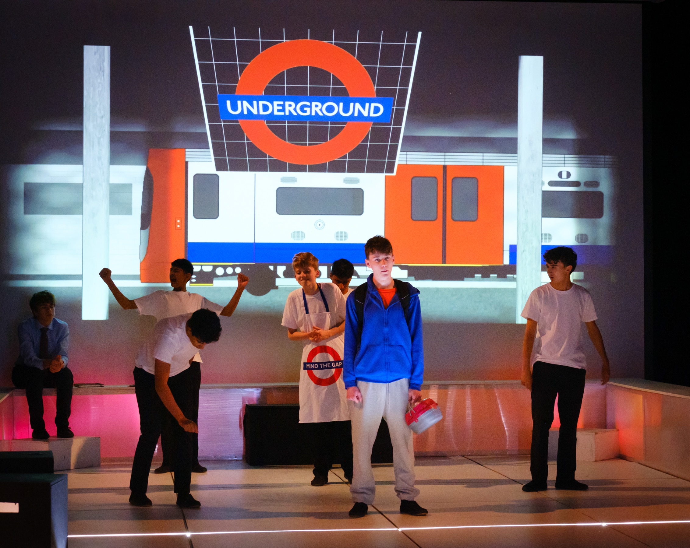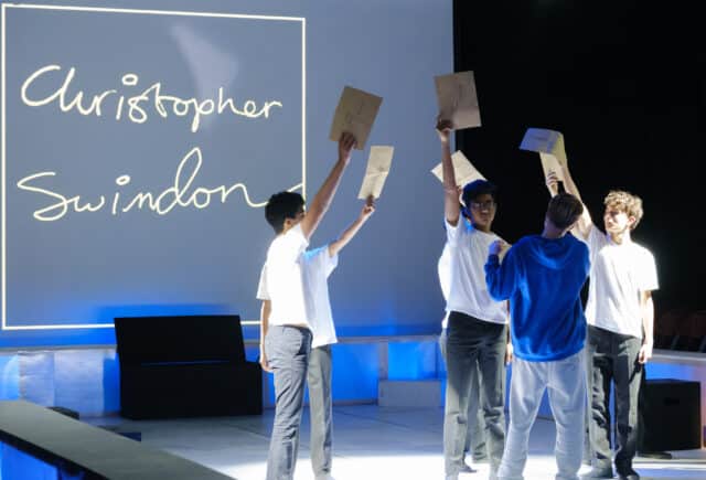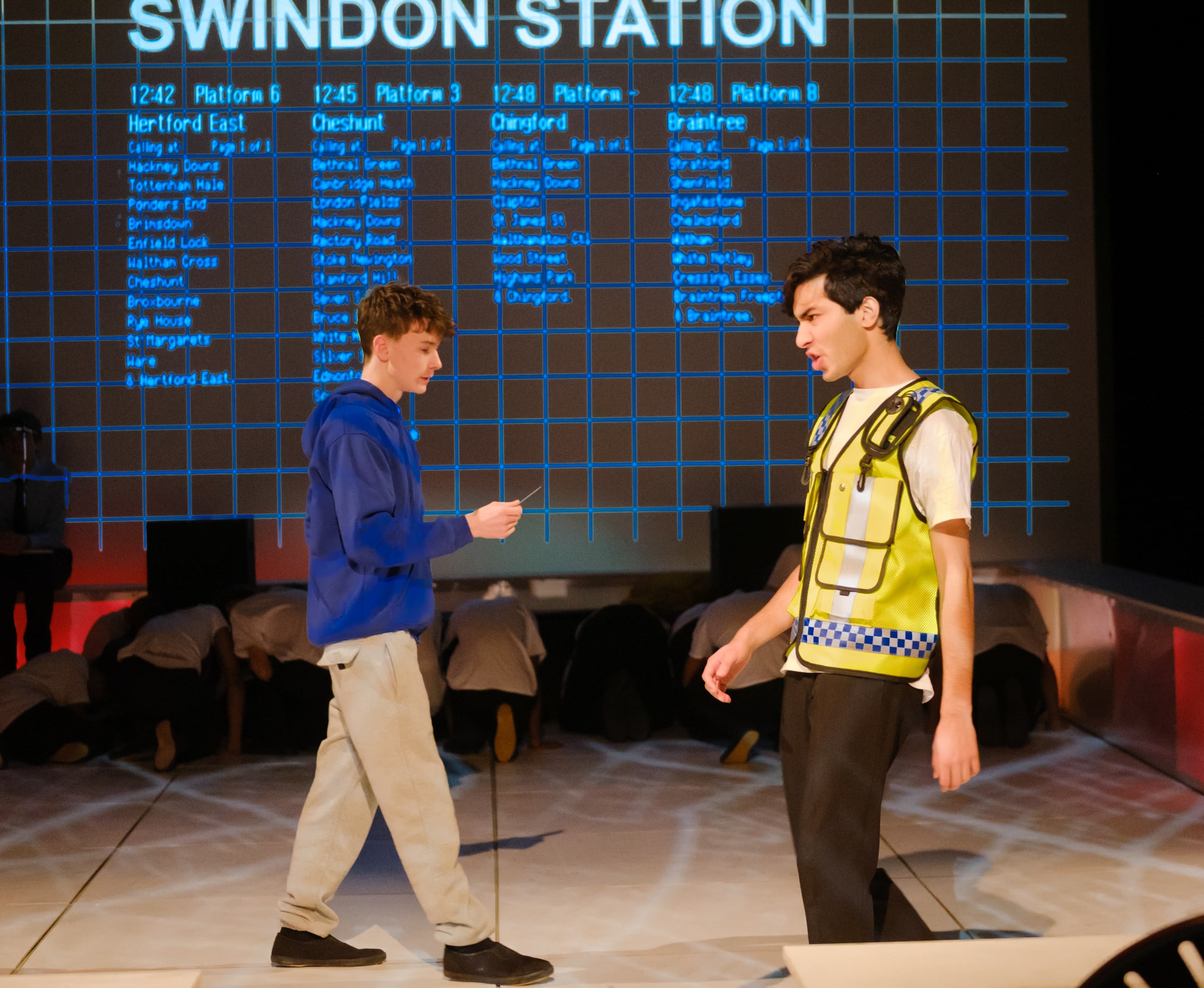 The ensemble, featuring Anya M, Ryan K. (5ths), Parth D. (Divs), Dylan M. (Divs) and Zayaan K. (Divs) ably created the disorientating environments with which Christopher must contend, from Willesden Junction to the outer reaches of the galaxy, they each added texture and momentum to Christopher’s journey. Smaller cameo roles were handled with flair and commitment: Chaitya J’s (L6th) sharply comedic Uncle Terry, Jai M’s (L6th) assured Man Behind Counter, Krish P’s (Divs) suspicious, jaded Mr Thomson, Markus F’s (Divs) unconventional information clerk – “Choooob!” – and strong turns from Mahir S. (Divs) and Leo B. (Divs) as the Drunks, also modelled on no one we know.