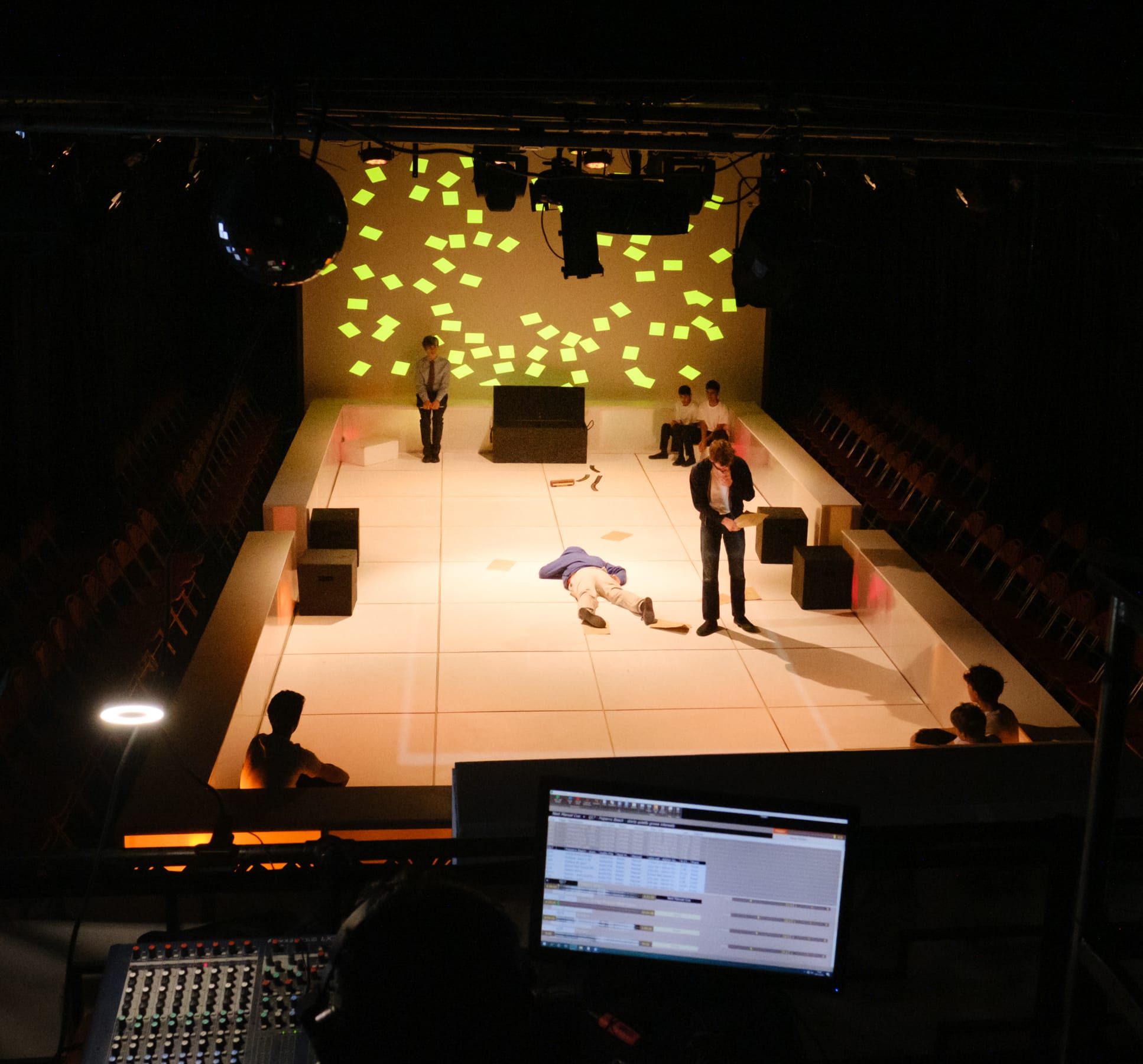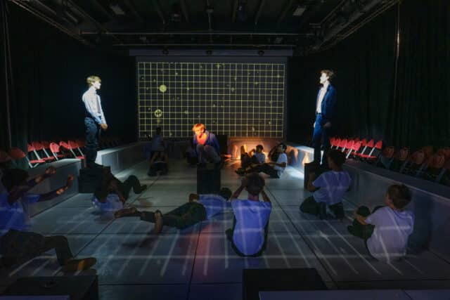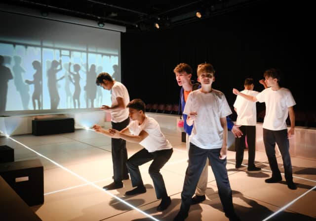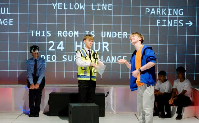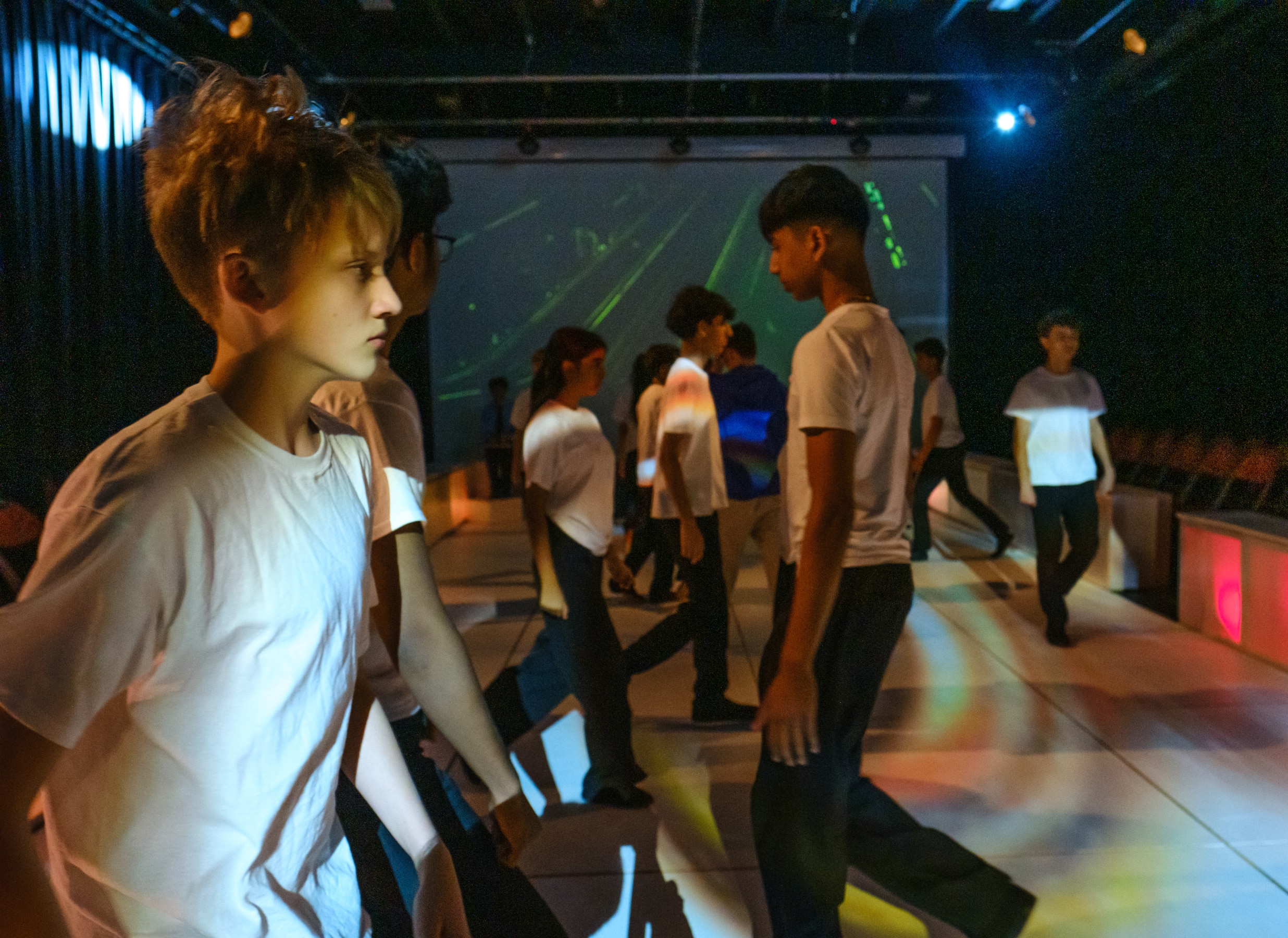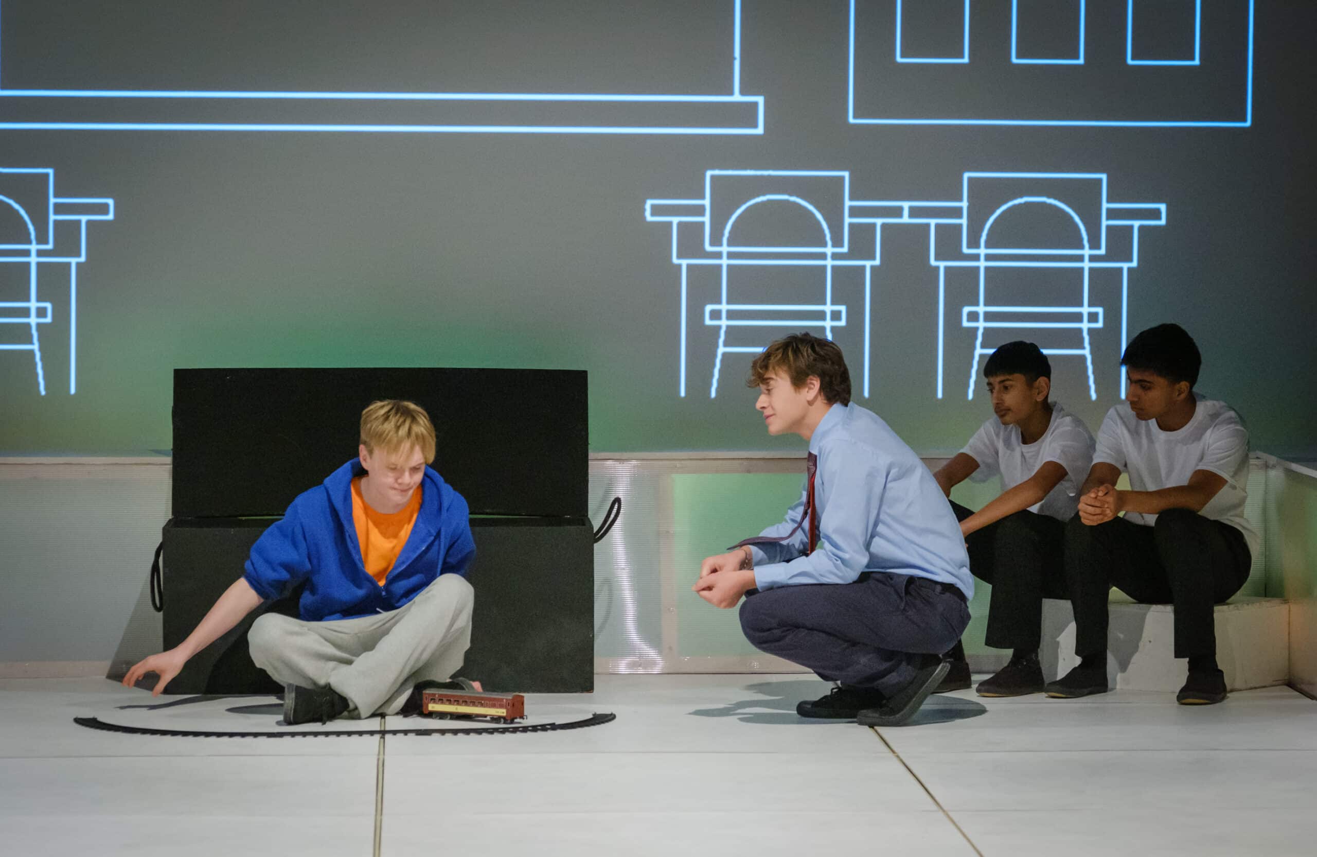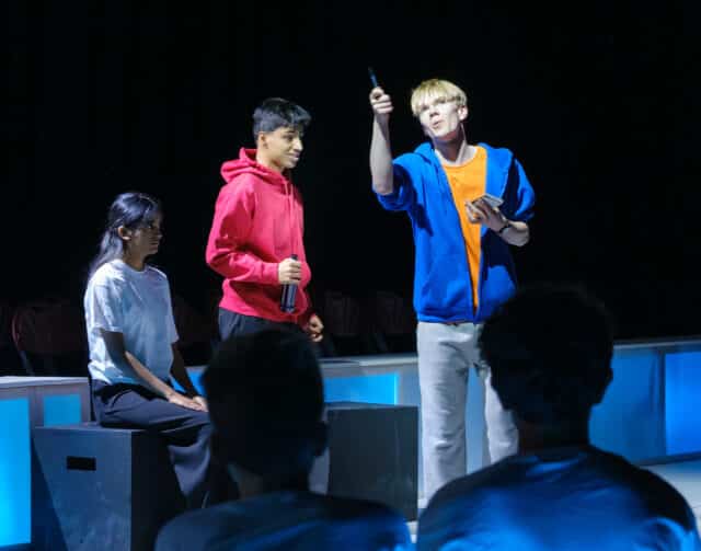 The ensemble, featuring Anya M, Ryan K. (5ths), Parth D. (Divs), Dylan M. (Divs) and Zayaan K. (Divs) ably created the disorientating environments with which Christopher must contend, from Willesden Junction to the outer reaches of the galaxy, they each added texture and momentum to Christopher’s journey. Smaller cameo roles were handled with flair and commitment: Chaitya J’s (L6th) sharply comedic Uncle Terry, Jai M’s (L6th) assured Man Behind Counter, Krish P’s (Divs) suspicious, jaded Mr Thomson, Markus F’s (Divs) unconventional information clerk – “Choooob!” – and strong turns from Mahir S. (Divs) and Leo B. (Divs) as the Drunks, also modelled on no one we know.