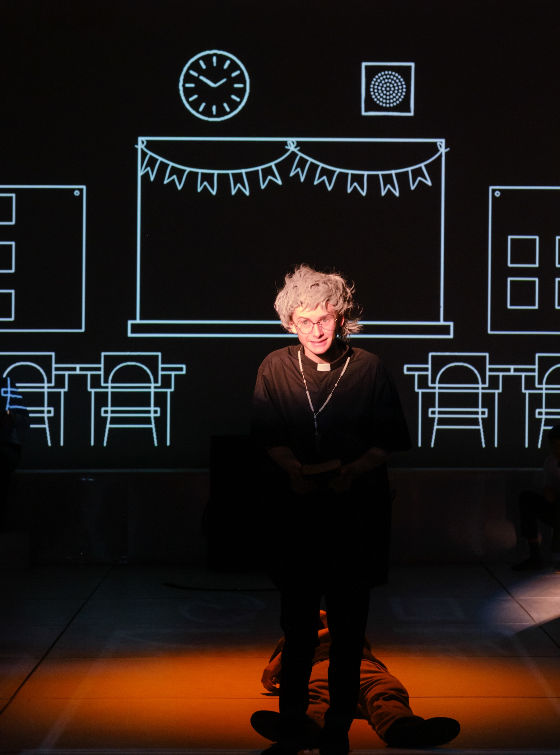 Monty H. (5ths) gave us a delightfully puzzled Reverend Peters, nonplussed by Christopher’s cosmic questions, while Chase C’s (L6th) unhinged Mrs Alexander provided much-needed comic relief in a tense drama. Countering this, Owen S’s (U6th) layered, memorable Roger seethed with sinister energy, which highlighted Christopher vulnerability and exposure in a dizzying, dangerous world. Emily B’s also shone as the hard-pressed teacher, Mrs Gascoyne, based on no one we know, while Harlene K. offered a wonderfully grounded Mrs Shears.